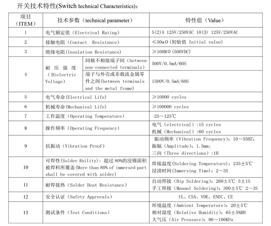 | 1 | Электрлік рейтинг | 5(2)A 125V/250VAC 10(3)125V/250VAC | |